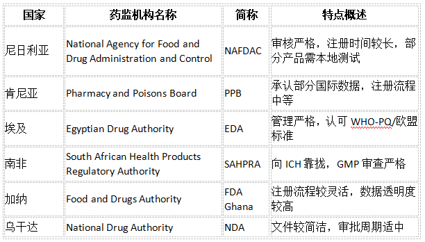 正遭到越来越多中国制药企业的注沉。凭仗复杂的生齿基数、日益增加的医疗需求以及对健康系统的投资加大,非洲成为药品出口的新蓝海。目前,非洲生齿已超14亿,医药市场规模于2023年已冲破600亿美元(数据来历IQVIA《Africa’s Pharmaceutical Market Outlook 2023》)。做为非洲次要药品进口来历国之一,中国药品正在部门国度进口占比跨越30%(数据来历:WHO Africa药品供应链调研)。但取此同时,非洲国度正在药品进口方面存正在律例分歧一、流程复杂、政策不竭变化等挑和。全球跨境医贸平台滴度医贸网为您系统梳理药品出口非洲的焦点流程取实操要点,帮帮企业少走弯、高效出海。非洲54个国度,每个国度的药监体系体例和准入尺度差别大。以下为部门沉点国度药监机构(NRA)简介: