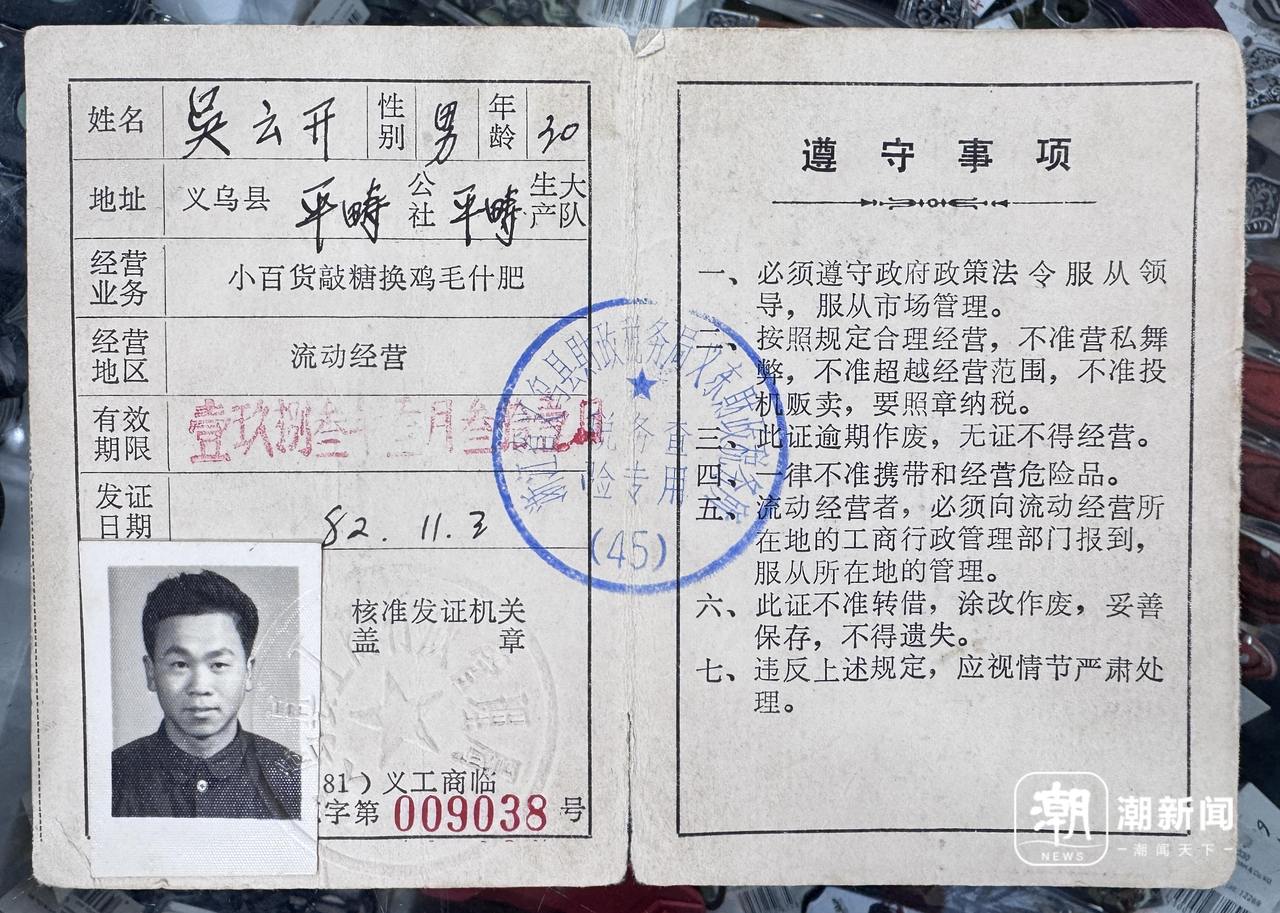 义乌,位于浙江中部,是一座既不靠山又不临海的小县城。20世纪70年代,“七山二水一分田,一个喇叭响全城”就是昔时义乌的实正在写照。“那时候义乌穷啊,地盘里长不出什么庄稼,穷得吃不上饭,义乌人嫁女儿都是要嫁到江西或者福建等地。”吴云开回忆起以前的岁月甚是感伤。20世纪70年代末,跟着大门初启,穷得“客岁总盼本年好,本年又是破棉袄”的义乌农人怀着脱贫致富的强烈希望和感动,沉拾“敲糖帮”的“鸡毛换糖”经商保守,小商品市场雏形初现。话语间,吴云开从腰间掏出一个信封,里面拆着一个特殊的证件,一份1982年11月3日义乌县工商行政办理局颁布的“小百货敲糖换取鸡毛什肥”姑且许可证。吴云开保留得很好,其时的他方才30岁,证件上的口角照片还显得有些青涩。
